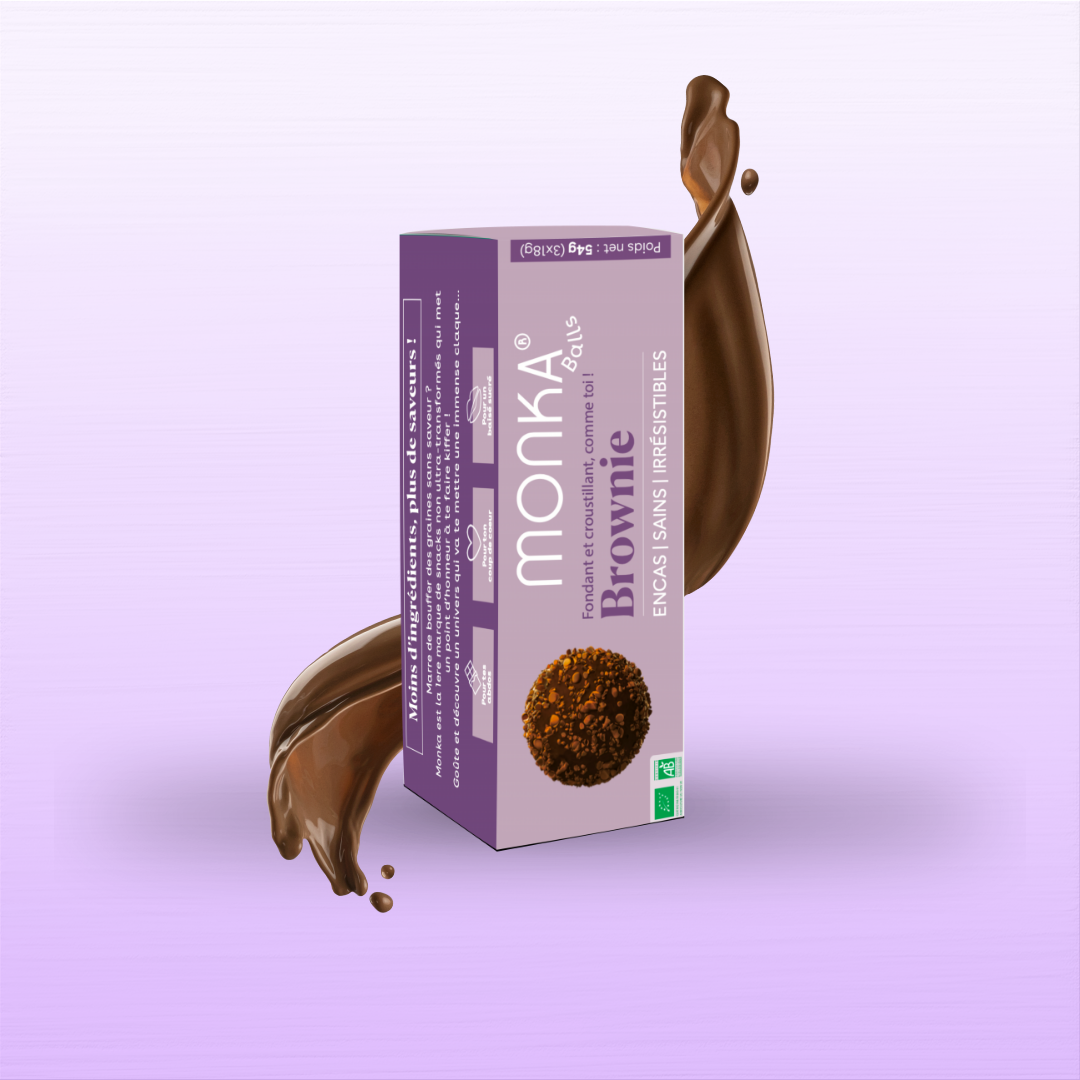 Monka Brownie BIO. Ingrédients : Dattes*, chocolat noir du Pérou à 50%* (masse de cacao, sucre de canne, sucre de betterave, beurre de cacao), flocons d’avoine (sans gluten), poudre d’amandes, huile de coco*, cacao*, éclats de noisettes* (noisettes, sucre de canne), sel de fleur de Guérande*. Issus de l’agriculture biologique.